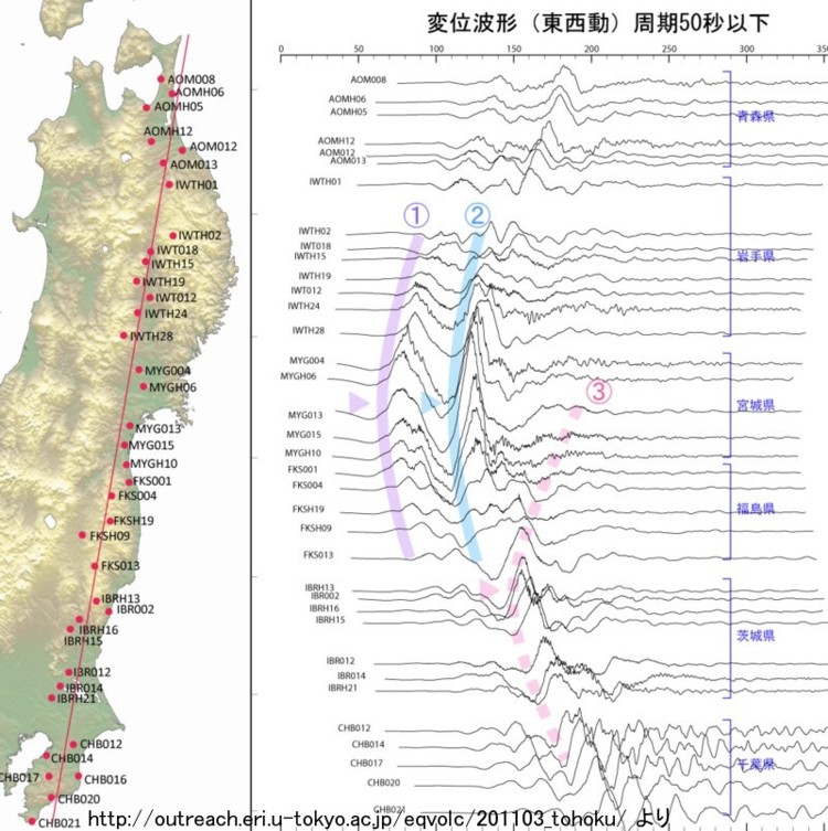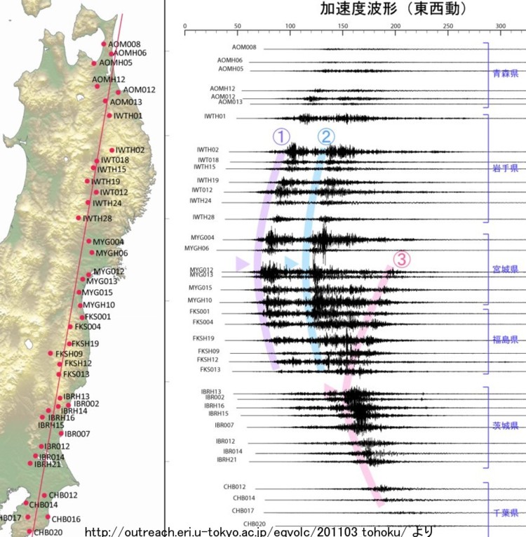 | 1658 Date: 2011-05-06 (Fri) M9地震の真相は複数爆発である 東京大学地震研究所の広報アウトリーチ室が開示しているサイトに、東北地震の地震波形を沿岸に沿って表示してあるものがありました。[1643]でも紹介したM9.0地震が複数の爆発で構成されていることを示す興味深い解説がありましたので紹介しておきます。 ーーーーーーーーーーーーーーーーーーーーーーーーーーーーーーーー 地震動分布から直接見る震源断層の破壊過程 防災科学研究所K-NET、KiK-net強震計(加速度)記録を太平洋岸に沿って南北に並べることにより、本地震の約500 kmにわたる断層破壊過程を直接かつ詳細に知ることができる。 ![]() 最初の大きな断層破壊は宮城県沖で起き、強い地震波が東北日本全体に放射された(図中の紫色の線)。その数十秒後に宮城県沖で大きな断層破壊が再び起きて強い地震波が放出された(水色)。地震波の到着時刻は、破壊開始点からの距離とともに遅くなるが、距離による時間差は二つ目の断層破壊(水色)では小さい。このことは、二つ目の断層破壊が、陸から遠く離れた沖合で起きたことを示している。 それから間髪をいれずに、三つ目の断層破壊が茨城県北部の、陸に近い沖合で(赤色)起き、茨城県〜栃木県に強い揺れが放射された。 ![]() なお、変位波形記録では、三つ目の地震は放射が加速度記録ほど明瞭でなく、断層の破壊特性や地震波の放射特性が異なっていることがわかる。 ![]() なお、一連の地震の結果として起きた海底変動の様子がNewton誌に載っていましたが、測量したものか、推定値なのかは不明です。 ![]() いずれにしても、本震だけでも複数回の爆発が短時間内で起きており、余震を含めると次図のように多くの爆発が起きていますから、実際は複雑な隆起・沈降現象になっているはずです。 ![]() 今回の地震で沿岸域で沈降現象が起きていますが、これはスマトラ沖地震でも起きている現象で、バンダ・アチェの町が大きく沈降して姿を変えたことが記憶に新しいところです。これも[1522]で解説したように、地震爆発論でならば、説明可能です。 「いつも丁寧な説明ありがとうございます。実は私は最近あるセミナーで京都大学の地震学者から直接聞いたのですが、今回の地震で地盤が沈下したことは説明できない現象であると言ってました。先生の押し円錐理論では明らかに宮城県を中心とする一帯は引き領域であるために地盤沈下を起こしていることは簡単に分かるのですが、定説では説明が難しいのでしょうか?その辺の解説もお願いしたいです。」 というメールをいただきました。新聞報道などでは、陸側プレートが沖方向に移動し、その空間を埋めるために沿岸部が沈降した、という書き方になっています。地震研究者はこれを認めていないということなのでしょうか、新聞記者は定説で認めていないことを勝手な憶測で書いている、ということになってしまいますね。 ![]() [1651]で紹介した産経新聞の記事は東大の地震学者の解説になっていますから、地震学者の間でも、統一意見はないのでしょうか。とにかく新聞などで、地震学者が解説する内容はもはや陳腐なものになっています。 |