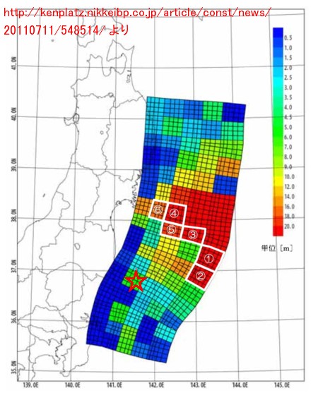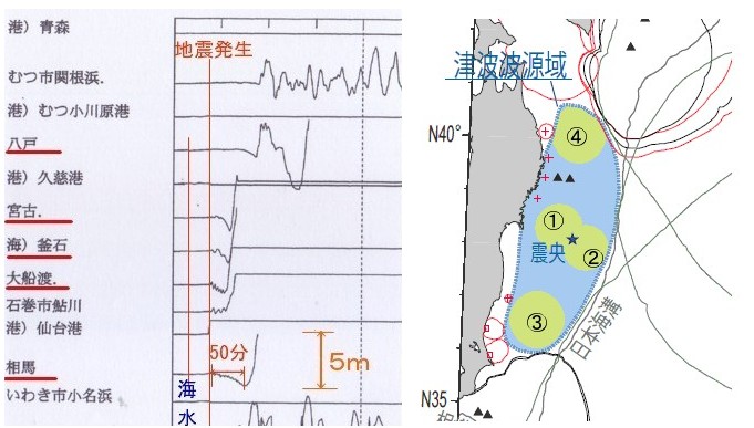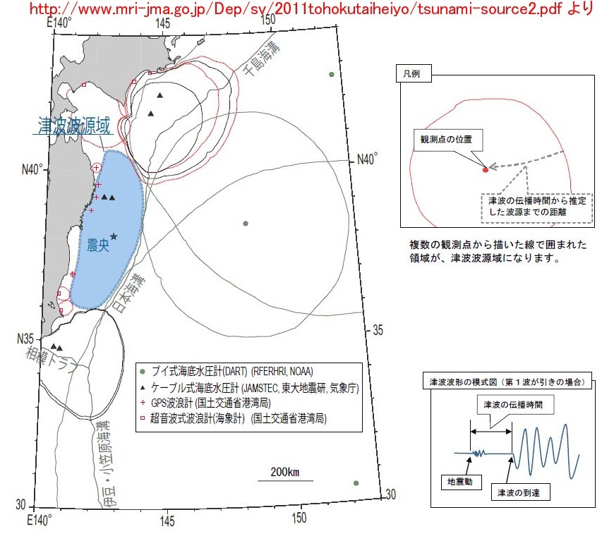| 1674 Date: 2011-05-27 (Fri) 東北沿岸を襲った津波のほんとうの波源域 「1671」では、「津波の到達時刻から、津波を逆追跡して津波発生領域を決定することができ、それを津波の「波源域」と呼んでいますが、今回のように少なくとも三つの震源がある場合にはその追跡計算はできないでしょう。ましてや、プレートテクトニクス理論に固執していては、正しい解析・解明は不可能です。」と述べました。(正確な追跡計算はできないだろうという意味です。) 気象庁気象研究所の発表によれば今回の地震津波の波源域が岩手県沖から茨城県沖の長さ約550km、幅200kmの範囲に及ぶとされています。