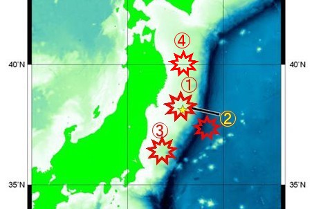 ![]() ![]() しかし、地震爆発論として検討すると、矛盾が見えてきます。 図に示された広大な波源域全体が隆起したのではなくて、今まで述べてきた三つの爆発に加えて、岩手県北部にもCという地震爆発が起きて、それぞれの爆発で波源域が発生しているのではないかと推定されます。 ![]() また、「地震動とほぼ同時に津波が観測された観測点は、波源域の中に含まれる」として三陸沿岸が波源域に含まれています。しかし、宮古、釜石、大船渡などでの「引き波現象」は「モーゼ効果」または、海水の地殻内部への「吸い込まれ現象」によるものであり、津波の第一波として「引き波」が来襲したというのではないと考えられます。地震発生後30分程後に「押波」として襲来しているのが津波としての第一波であると考えられます。したがって、波源域はもっと沖合にあるはずで、上図に示したように本当の波源域は四箇所に存在しているのではないでしょうか。 四番目の地震爆発が岩手県北部沖合で発生していた可能性は次の図からも推定できることです。 ![]() プレート論では、プレートが潜り込んで、断層破壊が次々と時間差をとって各所で発生したという解釈になるのでしょうが、剛体であるプレートがそのような挙動を示すということには説得性がありません。プレートテクトニクス論を早く捨てていただきたいと思います。 |