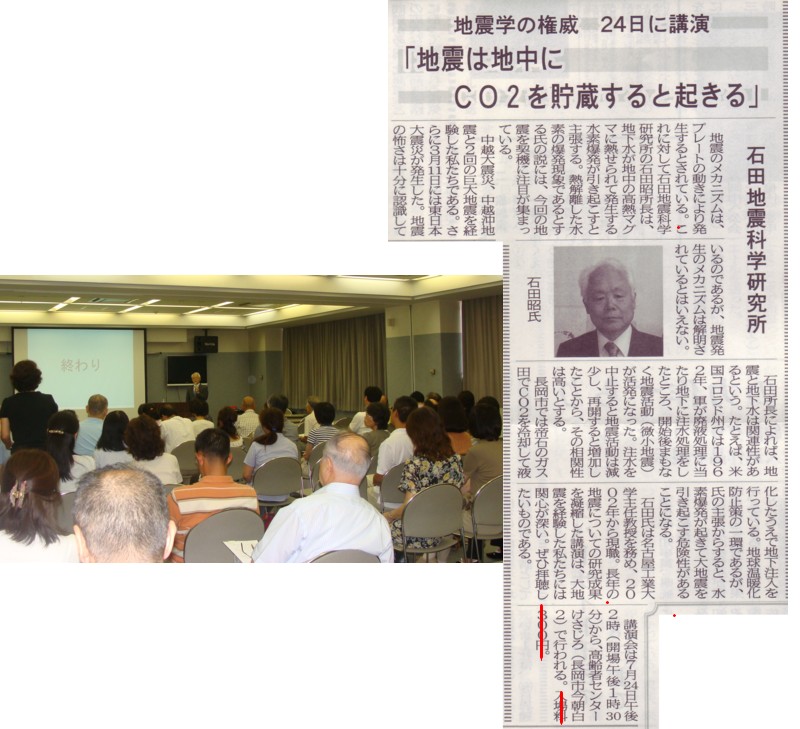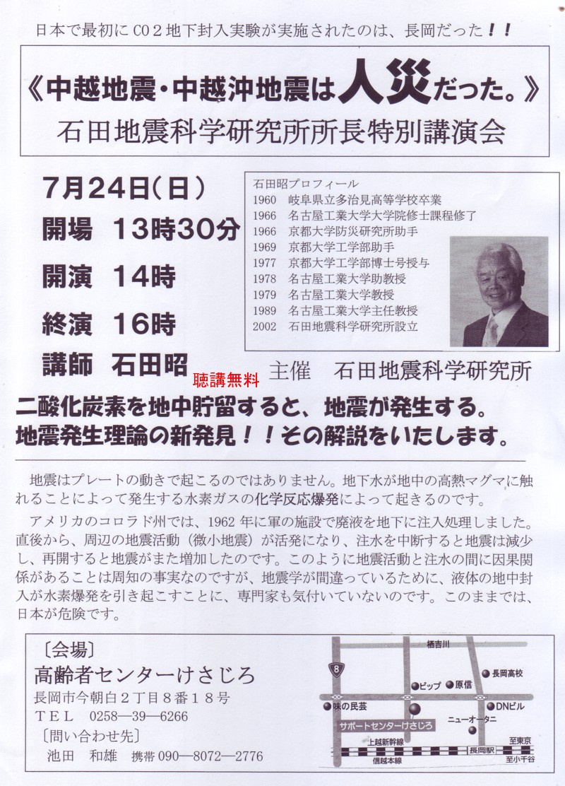 | 1689 Date: 2011-07-25 (Mon) 長岡講演会大成功 昨日24日、長岡市にて講演会「中越地震・中越沖地震は人災だった」を行なってきました。事前に長岡新聞が下記のような記事を掲載して下さっていたので、沢山の市民(70名)の聴講がありました。30分の質問時間内に質問し切れなかった方が遅くまで残り、様々な話題について議論の花が咲きました。高校で物理学を教えていた元教師の方は「子供に本当のことを教えられなかったことが残念だ、もう人生を元に戻せないが、草葉の陰から教えるよ・・・」と笑っておられました。また、社会の矛盾を深く追求しておられる真摯な中年男性、水蒸気爆発との関連を質問された方などなど、議論にご参加くださった方々に御礼申し上げます。 ![]() 定説地震学の間違いを正さないと、CO2の地中封入によって地震が起きることが理解できません。今後日本各地に地震と津波が発生する危険性があるわけですが、その理解が今回の講演会を機に確実に進行していくのを感じました。参加者のなかには、遠方から新幹線で駆けつけてくださった方もあり、次のようなコメントを頂戴しました。 ――――――――――――――――――――――――――――――― 「私は、工学部・電子工学専攻、音響商品を設計していた電気屋です。定年退職後、理工系の偏りを補うために放送大学に入学して文系科目を選択し、大陸移動説やプレート・テクトニクス説に出会いました。 パンゲア超大陸から分離・北進したインド亜大陸がユーラシア大陸に衝突して、エベレスト山脈とチベット高原を形成したこと。 三陸海岸や宮城県沖の地震は、太平洋プレートが北米プレートに潜り込み、北米プレートが変形するのが原因であること。などなど・・・ 放送大学の学習以来十余年間、教科書と教授を信じてきましたが、東日本大震災の後、石田先生の新地震論を知り、読破を続けています。 ・水の惑星(地球)は生きている、 東京三菱UFJ銀行藤が丘支店 |