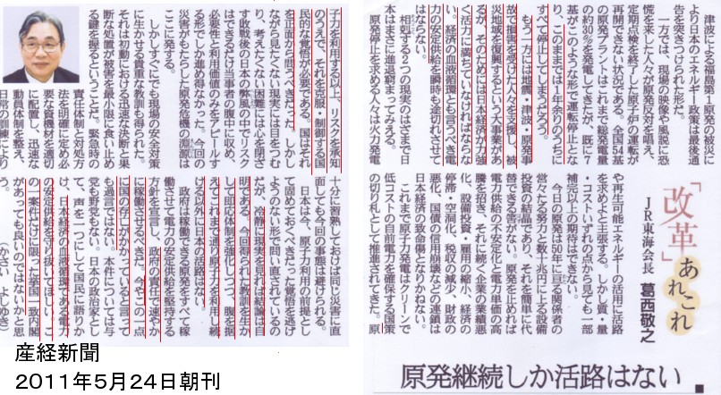| 1673 Date: 2011-05-24 (Tue) 原発継続しか活路はない 原発を停止させ、;火力発電、地熱発電を推進すると、地震誘発が頻繁となり日本経済は回復不能の窮地に陥ります。それを心配してか、JR東海の葛西 敬之会長が、今朝の産経新聞に「原発継続しか活路はない」という発言をしておられます。全く同感ですので、地震学セミナーとしては異例ですが、会長の主張を紹介します。マスコミに巣食う左翼活動家的発想に惑わされてはなりません。 ――――――――――――――――――――――――――――――― ![]() (原発は)既に7基がこのような形で運転停止となり、このままでは1年余りのうちにすべて停止してしまうだろう。 ―――――――――――――――――――――――――――――― |