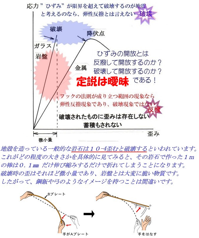 | 1678 Date: 2011-06-11 (Sat) 蓄積された歪が解放されて地震が起きるというのはウソ ある方が「なぜこんな大地震の予知ができなかったのか?」というタイトルで、定説地震学者へのイチャモンを付けておられます。http://homepage3.nifty.com/nanamas/nana25a101.html ーーーーーーーーーーーーーーーーーーーーーーーーーー 「今の地震学者が取る「地震予知」の手法というのは『測地法』というものだそうですが、上記によれば別の測定装置方法を提案した故・高木博士という方がいて、昭和34年ころに国会の機関で採用提案がなされたそうですが、当時の地震学者達は『測地法』にこだわり、言うに事欠いて「なんでそうなるかわからないようなもので測定するなどと言うのは非科学だ」と決めつけたらしく、当時のそこの会の委員長が思わず学者たちに「科学のあり方」への疑問で苦情を述べたという話が国会議事録として残っているとそのままアップされています。この方法は費用的に『測地法』よりずっと安上がりだったらしいのですが・・・結局、主流派地震学者に押し切られてしまってうやむやで終わってしまったらしいですが・・・。そういう議論したことを記録に残すことにさえ難色を示した学者もいたそうです。」 ーーーーーーーーーーーーーーーーーーーーーーーーーー 私も、高木博士考案の地震予知手法が気象庁で採用されて観測が実施されていたとすれば、地震学はもっと進歩していただろうと残念に思っております。その原因は東京大学を頂点とする歴代の地震学トップリーダー達に責任があると考えています。 以下に紹介するのは、以前[1293]でも紹介した上田誠也先生の講演の一節です。先生はプレートテクトニクス理論を日本の地球物理学会に普及させた功労者と目されている方ですが、電磁気的手法による地震予知にも尽力されています。しかし、地震発生に関する認識はプレート論に拘束されたままですので、このままでは地震学の大きな脱皮には貢献できないだろうと思います。 では地震はなぜ起こるのでしょうか。それは断層が急激に動くことによってです。それによって、振動が起こり、大地が揺れるのです。阪神大地震のとき、淡路島の野島断層は1ないし2メートルずれました。では断層運動はいったいなぜ起こるのか。世界の地震は主として帯状の地域で起きています。皆さんはプレートテクトニクスという言葉を耳にされたことがおありでしょう。その考えによると、地球の表面は10個あまりのプレートに分かれています。プレートはそれぞれ動いていて、衝突したりずれたりして、その境界ではストレスが溜まります。そのストレスを解放するために断層が動いて地震が起きるのです。日本列島はそういうプレート境界にあるので、M6以上の地震が毎月平均一回くらいどこかで起きています ではなぜプレートが動くのでしょうか。簡単にいうと、プレート運動はマントル対流のあらわれです。マントルは固体ですが、ゆっくりゆっくりと流動しているのです。ではいったいなぜマントル対流が起こるのか。それは火の玉だった原始地球が今なお冷えつつあるからです。お味噌汁が冷えるときにお椀のなかに見える対流と同じようなことです。 (日本学士院会員・東京大学名誉教授・東大・理・昭27) (本稿は平成19年3月9日夕食会における講演の要旨であります) 問題点を述べます。 断層が急激に動くことが地震であると、結論が最初に来ていますが、因果関係が逆転しています。 さて、プレートの境界にはストレスが溜まります・・・そのストレスを解放するために断層が動いて地震が起きるのです・・・とかありますが、ストレスとは応力のことで、何らかの外部からの力(外力)に対応して、内部的に応ずる力のことで、それを生み出すために歪(ストレイン)が発生します。ストレス(応力)が溜るというのはおかしな言い方で、医学的な精神的ストレスとの混同があるのではないでしょうか。応力は蓄積されません。 ![]() また、プレートには長い年月の間に歪が蓄積され、弓が矢を放つようにその歪が解放されて地震が発生する、という解説がなされます。しかし、弓が蓄積する歪は弾性歪というもので、弓が弾性体であるから成り立つ話です。ストレス(応力)とストレイン(歪)の関係を示すのがフックの法則と言われるもので、破壊するまでの間は弾性体なら比例関係にあります。弾性体では、歪(ストレイン)も応力(ストレス)も外力が作用しなくなれば、ゼロになってしまいます。弓が持つような弾性体としての歪のことを弾性歪といいます。しかし、高温の岩盤は釜から出てきた圧延中のガラス板を想定すれば分かるように、完全な弾性体ではあり得ません。外力が働いて瞬間的に応力と歪が発生すると、たいていは膠(にかわ)や松脂のように応力がゼロになるように変形します。この変形は弾性歪とは違う永久に戻らない永久歪です。これは粘性体の変形であって、外力が外れても、外力が掛かる前の状態