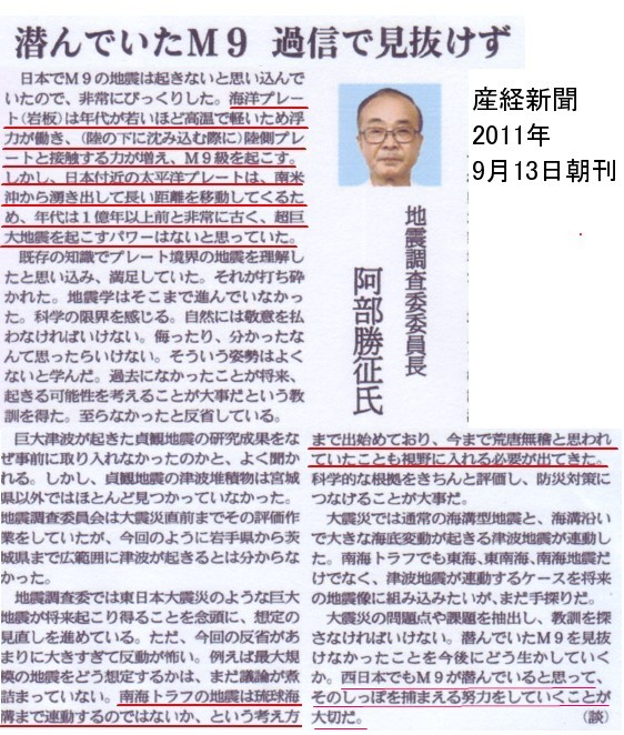 | 1700 Date:2011-09-14 (Wed) 脱プレートテクトニクス運動と地震学ルネッサンス運動の勧め 13日の産経新聞に東大名誉教授の阿部勝征先生が「潜んでいたM9 過信で見抜けず」という反省的談話を述べておられます。