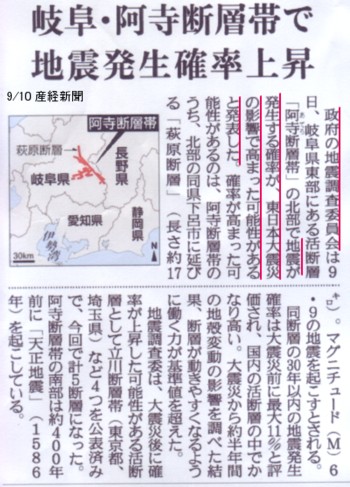 | 1701 Date:2011-09-14 (Wed) 無駄な委員会は廃止したらどうか 今回の東北地震による影響が内陸部の岐阜県にまで及び、阿寺断層での地震発生確率が増加したと政府の地震調査委員会(阿部勝征委員長)から発表されたという報道が産経新聞(9月10日付)にありました。