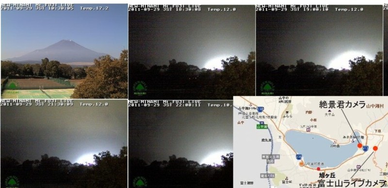 | 1708 Date: 2011-10-03 (Mon) 富士山麓での発光現象 9月29日6時半から22時半の間に山中湖東端に設置してある富士山ライブカメラが発光現象を捉えていたという報告をT氏から受けました。このカメラはグリーンヒルズニューみなみに設置してあるものです。http://www.new-minami.co.jp/livecamera_past.php 富士山の麓付近で明瞭な発光現象があることは分かるのですが、場所の特定は無理のようです。
