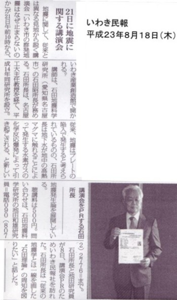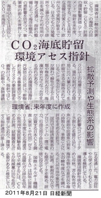 | 1693 Date: 2011-08-22 (Mon) いわき市講演会大成功 いわき市での講演会は大成功でした。定員100名の会場はほぼ満杯で、参加者の地震への関心も高く、たくさんの質問を頂きました。前日にも大きな地震が起こっておりましたが、当日の日経新聞に載っていたCO2海底貯留に関する環境アセスメントの話題では、CCSによって地震が起きる危険性は全く認識されておりません。なぜこれほどまでにいわき市付近で地震が続くのか、関係者に真剣に考えて欲しいと思います。 ![]() 日経新聞の報道では、環境アセスメントをこれから行うという報道ですが、いわき市勿来では既にCCSの操業が行われているはずです。このセミナーで紹介してきたように、長岡市の岩野原基地と秋田の雄勝実験場で基礎データを集積し、その情報の下に本格的な操業を勿来の(株)クリーンコールパワー研究所という会社で実施していることが、ネット上で明らかにされております。報道の裏には、何か隠されたものがあるような感じがしてなりません。