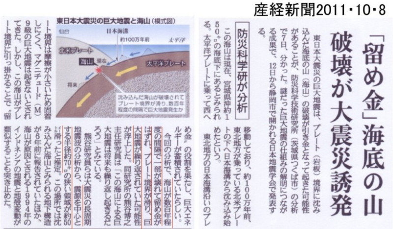 | 1710 Date: 2011-10-08 (Sat) 研究者も報道人も謙虚に仕事をしよう 「海山が陸の下に潜る」・・・こんなおとぎ話のような話が通説地震学の世界では論文として通用し、なんら疑問符もなく新聞にも取り上げられるようで驚きます。 既に3年前のセミナー[1448]、[1490]、[1491]などで紹介したものですが、