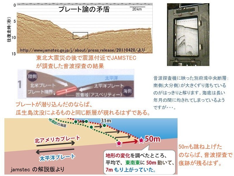 そこで、次のような「プレート論の矛盾」という一枚を作ってみました。仙台講演会で多くの方に聴講していただきたいので、知り合いにチラシと絵を送って拡散していただければと思っています。