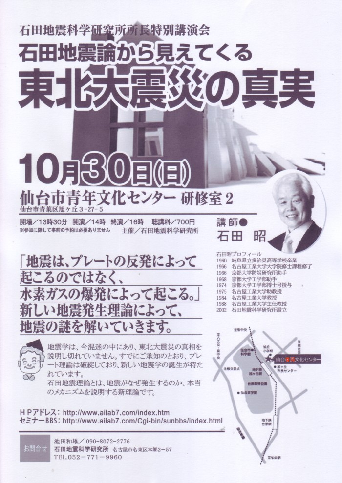 | 1709 Date: 2011-10-08 (Sat) 仙台講演会のお知らせとお願い 第四回目の講演会を10月30日に仙台市青年文化センターで行うことになりました。 ![]() タイトルは「東北大震災の真実」としておりますが、この大震災は自然地震とそれによって引き起こされた人為的地震との複合作用によって大きな被害を生じた可能性があります。そうした地震の真相をお話したいと思っています。