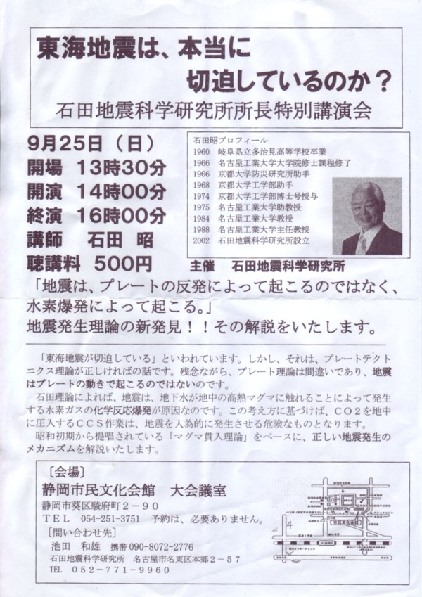 ![]() ――――――――――――――――――――――――――――――― また質疑では「東海地震は本当に切迫しているのかどうか?」という切実な質問がありました。それに関しても会場では説明し切れませんでしたので、ここで結論を述べておきます。 @ 切迫説には明確な理論的根拠がない。プレート論をベースにするこれまでの発生時期に関する諸説は全て外れてきた。この35年間、静岡県民は不安感に苛まれてきており、地震学者に対する不満の声が満ちている。地震学を研究する学者は猛省を忘れてはならない。 A しかし、切迫していないという証拠もないことは今回の東北大震災を見てもわかる。 B ところが、地震爆発説で考えれば、電磁気的手法による地震の短期予知は将来十分に成功する可能性がある。一方長期予測は不安感を増幅させるだけであり、全く意味がなく、地震発生確率グラフは破棄するべきである。 C 石田地震科学研究所としては、社会に安心感を醸成するために、ANS観測網を完成させたい。原理的には完成しているが、長期にわたる「ボランティア観測・報告」には無理がある。ANS(安心ネットワークシステム)観測網は国家機関で取り組むことを希望する。 以上です。当日ご参加くださり、終了後もロビーで熱心に意見交換をしていただきました参加者の皆様に感謝申し上げます。 追記: [3142]に爆発理論の修正(シンプル化)が載っています。 |