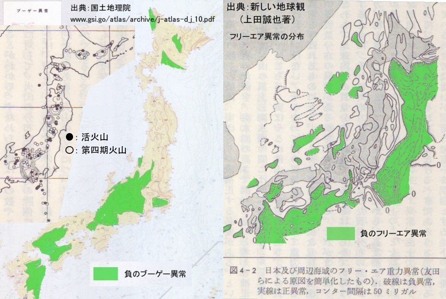 さて、松山先生が発見されたフリーエア異常は海洋部分の重力異常の研究ですが、陸上部分の異常はブーゲー(bouguer)補正の必要があります。石田理論として考えているブーゲー異常の原因は花崗岩の存在であるとしてすでに[1785]重力異常が証明する大陸化機構で解説しましたが、フリーエア異常(フリーエア補正した後でも見られる重力の異常のこと)原因はどんなことが考えられるのか、を述べてみます。 ![]() 左の図は日本列島におけるブーゲー異常ですが、マイナス(地下に軽い物質があるということ意味する)になる原因は石田理論では、