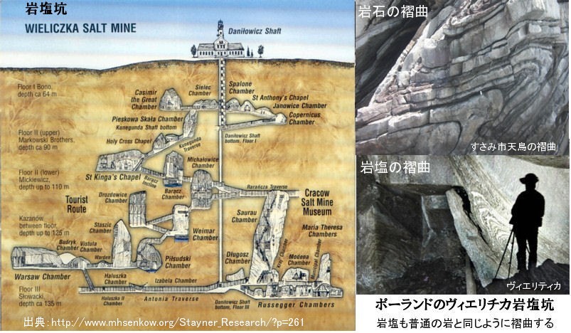 | 1815 Date: 2013-04-05 (Fri) 海底の岩塩層が教える地球史(2) 厚さ2000mの岩塩層がブラジルとアンゴラの沿岸海底の下にあることには驚きます。また、厚さは十分の一ほどですが、陸上でも観光地として有名な岩塩坑があります。ポーランドのヴィエリチカ岩塩坑は、古くからの観光名所で、岩塩を彫刻した様々な立像、シャンデリアなど人気を呼んでいるそうです。 興味深いのは、その岩塩層にも、普通の堆積岩に見られるような褶曲があることです。 ![]() 地層が「たわむ」時には、元には戻りませんから、応力と結びついた「ひずみ」つまり「生きた歪」はありません。この場合、歪は全て永久歪、「死んだ歪」になるのです。褶曲のでき方を説明するプレート論の考え方は、長期的には「生きた歪」は解消して蓄積されないということと同じです。つまり、長期的に蓄積される「生きた歪」は存在しないのです。「死んだ歪」など怖くはないのです。 プレート論には矛盾がいっぱいです。「活きている」という活断層が幽霊であることが理解できるでしょう。 写真はユタ州プロボ峡谷の褶曲ですが、解説文(「知られざる地球」NGS)にはさらにこの地層を形成する堆積物は、「もぐってゆくプレートから切り離され、新しい陸地になって大陸にくっついた。」と付加体理論を使って説明しています。 ![]() さて、岩塩でも褶曲するという事実は、少なくとも一回は、海底の海水の溜り場→浮上→岩塩層形成→海底に沈降→半溶解状態で褶曲→浮上、というプロセスを経て観光客の前に姿を現しているはずです。ましてや、2000mもの岩塩層を形成するのには、多数回の浮沈を繰り返してきたと考えるのが妥当な話でしょう。この3億年の間に一度も浮沈した地殻はない、海洋地殻は海洋のまま、大陸地殻は大陸のまま([1549])、というのは非科学的な話です。日本では四万十帯が、アメリカではユタ州などの東北部一体が付加体であるという説明になっていますが、これも「空想的な御伽噺」ではないでしょうか。 |