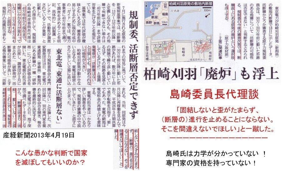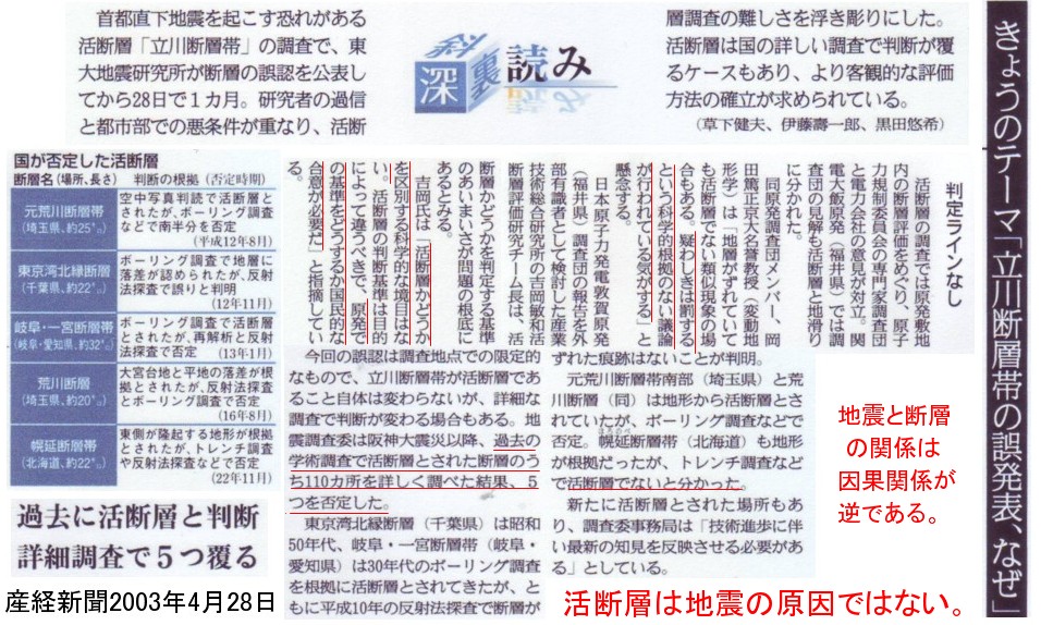 | 1824 2013-05-01 (Wed) マスコミ報道関係者にお願い 4月28日の産経新聞に「立川断層帯の誤発表、なぜ」という記事があり、専門家の間でも活断層を判定する明確なラインが無いことが報じられています。 そして過去の判定が否定された例があることも報じられています。 ![]() このように専門家によって判定が異なるような問題を、絶大なる権限を持つ原子力規制委員会の一部委員の判断に任せて良いとは思われません。 少なくとも記事にあるように国民的な合意を得る必要があります。 そして国民の皆様には活断層に関する「種明かし」も知っていただき、後世のために正しい判断をして欲しいと思います。そのためには、 まずマスコミ関係者が異なる見解があることを国民に報道する義務があると思います。石油や石炭に関しても化石燃料ではないことは隕石の研究から判明しているのにもかかわらず、 「一度誰かが名前を付けたら、みんな信じ込んでしまったと言う訳です。」とゴールド博士が述べています。 やがて化石燃料と云う概念も消えるでしょうが、地震の原因説に関しても、いろんな見解があることを報道するのがマスコミの貴い使命のはずです。 マスコミは報道してください。お願いします。 一度誰かが活断層という名前をつけたら、みんな信じ込んでしまった、と云うだけなのです。 |