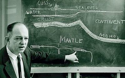 | 1813 Date: 2013-04-02 (Tue) ギョー(guyot)の形成について(3) 地学雜誌(第 673〜674 号)にguyotのことを「溺れ島」と云う表現で紹介する記事がありましたので、紹介します。guyotの名付け親であるプリンストン大学のハリー・ハモンド・ヘスの論文を紹介する記事です。ヘスは自分が発見し、名付け親となったguyotが深海にある理由を説明するために、プレート論の言いだしっぺになったのでしょうか。そうだとすれば、人類に随分回り道を強いてしまったように私には思われます。 ![]() Harry Hammond Hess(1906-1969) ーーーーーーーーーーーーーーーーーーーーーーーーーーーーーーーーーーーーー 太平洋の中の溺れ島 太平洋の測深に関するデータが蓄積されるに從つて、太平洋の中には海面下数百乃至1.000尋の所に頂上を持つ溺れ島が沢山あることがわかつて来た。それに関しPrinceton大学のH. H. Hessは最近までのデータを綜合し、かつそれに基いて太平洋の地史に関する新しい解釈を述べているから、その大意を紹介する(Drewned Ancient Islands of the Pacific Basin, Smithsonian Institution1948) ------------------------------------------ これらの溺れ島は特徴のある形態を示し、全体として火山を想像させる楕円錐状を呈するが、頂上は平坦な面で切られている。頂上平坦面の大いさは小さなもので径2哩位、大きなものでは径35哩に達する。平坦面の周囲は外側に向つて2° 位傾斜した狭い緑を経て急に20° 以上の急傾斜になつている。また平坦面の上には全く堆積物を見ない。 この特異な溺れ島に対してHessは"Guyots"、と命名している。(19世紀の地理学者Arnold Guyot.にちなむ。) 今までにわかつたguyotの分布は、北緯20°前後で東経145° から西経165° の間と、北緯10°〜15°、東経160°〜170°の区域に特に多い。またすべて安山岩線の外側にある。 Marshall群島のatolls(環礁)はこのguyotの上に造碓珊瑚が生長してできたものである。原子爆彈の試験の行われたBikini Atollでは地震探査とボーリングで詳しい調査が行われたがguyotの上の珊瑚礁の発達が非対称的であるため土台のguyotはその影響で傾動していることがわかつた。 guyotの分布している区域は太平洋の中でも地質時代を通じて安定な剛塊であつたことは、地質的に認められている所である。またその区域内中にはハワイのような火山活動が見られるが、現世に限らず、古い地質時代にも同じような火山活動があったに違いない。それらの火山活動が休止してからはどうなったであろうか。恐らく侵蝕作用によつて海面近くまで平坦化され、やがて海蝕台として水面下に没したであろう。 ![]() 極の移動は、斉一的ではなく激変的ですからUFO型またはバッタの移動型のようになるはずです。したがって曲線で結ぶこと自体が意味を成しませんが、この曲線上のどこかに極があったことを意味しています。また、採取ブロックごとに移動曲線が違っていますが、これは当然のことだと思います。 なぜなら、岩石の残留磁気からその当時の極を推定するには、残留磁気の方位角と伏角を調べて決めるからです。各ブロックごとに違った形式で岩石の母体地盤そのものが、水平方向にも垂直方向にも「ねじれた運動」をする可能性があるわけですから、正確な極点を求めるのは不可能のはずです。 ![]() ![]() 下の二枚は太平洋にあるguyotの音響調査による形状ですが、太平洋が浮上することがあれば、上の写真と同じような偉容を見せてくれるでしょう。海底にあるのか、陸上にあるのかという違いがあっても同じプロセスで出来上がった山のような気がします。 ![]() ![]() マリアナ海溝に存在するいくつかのギョー(guyot)の形状 http://ccom.unh.edu/theme/law-sea/mariana-trench-pacific-ocean/mariana-obliques PS ヘスがこのように考えたのは、もう一人のHのつく地質学者、A・ホームズの研究が土台になっている。ホームズは、放射性元素による熱で、地球内部の物質は溶かされ、対流を行っている、と発表していた。ヘスは、ホームズの考えをとりいれて、湧き出した溶岩の板(プレート)は、内部の対流にのって運ばれていく、と考えた。 しかし、ヘスは、これを空想的なお伽話といっていた。この年(1962)、ヘスは米国地質学会会長に選出された。かれはこの着想が、当時の学会の風潮にそぐわないことを知っていた。しかし、ヘスの考えは、英国ケンブリッジ大学の地磁気研究者の成果と組み合わされて、地球物理学者の間に急速にひろがっていった。1967年の米国地球物理学連合会の総会のとき、プレート論は、従来の地球科学の学説に全面的にとって代わっていた。」 |