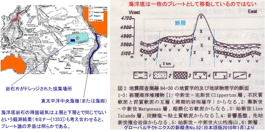 | 1812 Date: 2013-04-01 (Mon) 海洋地殻の形成を考える [1598]でも紹介しましたが、ロシアの研究者たちが東太平洋で詳細な海底調査を行っています。その調査結果からは海底の地殻が、一枚のプレートとして移動しているような証拠は何もありません。大陸の地殻と何ら変わりのない様相を示していることがわかります。 プレート論に拘っておられる方の認識を変ていただくために、もう少し詳しく海洋底地殻の実態を紹介します。タイトルは「太平洋、Clarion-Clipperton断裂地域の海洋底基盤からの岩石」というもので、ClarionとClippertonという二つの断裂帯の間にある中央海丘付近で、海底をトローリング、または、ドレッジして採取した採取岩について検討を加えています。 要点を抜粋して紹介します。 ーーーーーーーーーーーーーーーーーーーーーーーーーーーーーーーーーーーー 最近まで、 世界の海洋底の基盤岩は構造的にも物質的にも均質であるという概念が優先されてきた。 地球の海洋地殻上部すなわち海洋地殻第2 層を構成しているいろいろな年代の玄武岩質基盤は、 岩石学的に均質であり、 中央海嶺玄武岩からなると信じられてきた。(海洋底拡大説による認識) ここでは、 海洋底表面での採取岩の起源に関する3 つの仮定のもとに議論する。 第1の仮定は、採取岩がその地域起源であるとするものである: 角張った破片物質、 とくに新鮮なかけらは、 海底における基盤岩の沖積物質である。 地下深くにある基盤岩が断層帯に沿って隆起し、地塁や正断層崖に露出した。 円礫物質は礫岩由来の沖積物質である。 礫岩沖積物質は、 基盤岩の岩石露頭と同様、 海洋底に露出するものである。 この露出は、隆起した地塁では断層帯内、音響基盤の突出、および正断層崖にみられる。 ![]() 第2の仮定(第2と第3はプレート論者の認識)は、トローリングで採集されたすべての採取岩は氷山によって太平洋の赤道地帯まで運ばれてきたもので、相互に無関係な物質である、 とするものである。Mendocino 断層北側の北東太平洋の海山上での柱状コアにおいて、 岩石と典型的な氷山堆積物が識別され、研究された。第四紀のある時期に、カルフォルニア海流とともに移動してきた氷山が熱帯地方まで到達達したと仮定されている。現在、 北半球における氷山による岩石物質の分布限界は、 氷山の分布を最も南に想定しても、 それは北緯30° までと信じられている。更新世の最大気温低下期には古気候帯の境界が実際に赤道方向へ移動し、 海洋表面温度が全般に3°C 低下したとしても赤道地帯における海洋堆積物の生成に氷山の影響を想定することは不可能であろう。 もし、 Clarion-Clipperton海域から採集された採取岩の少なくとも一部が氷山による超遠距離運搬の付随的な氷山起源物質であることが今後の研究で証明されることがあれば、 そのときには、熱帯における鮮新世〜更新世の氷山分布の古地理学境界は著しく南寄りに訂正されなければならない。 第3の仮定は、流木の根や海棲動物による岩石物質の運搬である。 しかしながら、 この仮定には根拠がない。 結 論 1.組成から見て、 クラリオン- クリッパートン断裂海域の中央部でドレッジされた採取岩中の角礫状岩石片は、 おそらく時代の異なるコンプレックス(複合岩)(先カンブリア紀(?) 花崗岩- 変成岩コンプレックス、 白亜紀地向斜火山岩- 珪質岩- 堆積岩コンプレックス、 先始新世海洋玄武岩コンプレックス、 および玄武岩- 安山岩- 流紋岩コンプレックス)に対応する岩石学的関連グループにまとめられる。 2.全般的に、採取岩中の礫のほうがやや広い組成範囲をもつものの、採取岩中の礫の組成は角礫状岩石片のものに類似する。 3.従来の概念では世界海洋の基盤岩はかなり単純な地質構造と考えられているが、採取岩組成の研究は、 第3海洋層( 玄武岩の下位層) が異質な成因をもつ構造で構成されていることを示す。 第2海洋層の玄武岩の年代よりも古期の岩石コンプレックスによって形成された海洋地殻の複雑な地質構造発達史は、太平洋のこの海域の複雑な地史を反映していて、 全体的に北米西部の地史に類似する。 ![]() 海洋化の過程では、様々な岩石で構成される可能性があります。大陸上で浸食作用が激しかった場所では、花崗岩が基盤岩になるところもあるでしょう([1811]で示したように)。河川型浸食でできた礫岩もあるでしょう。陸上由来の火成岩もあるでしょう、何度もの隆起・沈降過程でできる変成岩・複合岩もあるでしょう。このように、様々の複雑なプロセスを経て地殻というものは出来上がっていると考えられます。沈降した花崗岩も海洋底と云う熱放出の少ない高熱下では溶融し、再度固化するときには玄武岩になると思われます。 大陸は花崗岩の存在が特徴的であること、海洋にはそれが少ないことは確かですが、それを除けば、海洋地殻と大陸地殻の違いは厚さが薄いこと、固化する前の堆積物があること、などを除いてほとんど差がないという認識が