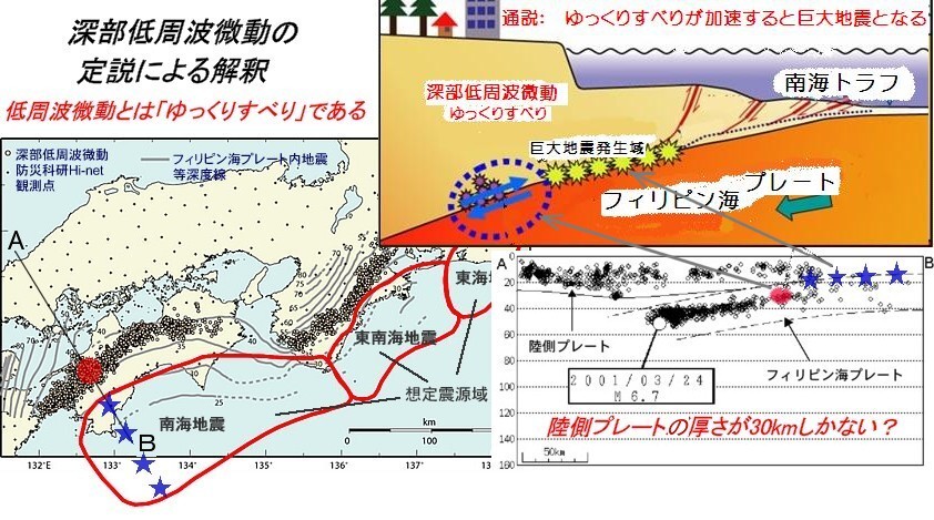 | 1855 Date: 2013-09-01 (Sun) 本日のメガクエイクを見た感想 本日のNHKメガクエイクでは「スロークエイク」の話題を放映していました(昨日は見逃しました)。この問題は「スロースリップ」、「スロー地震」、「深部低周波微動」としても取り上げられるものですが、このセミナーでは[273]、[1134]、[1245]、[1366]などで解説してきました。 石田理論では地下における「マグマ溜り」、およびその連結構造である「サージチャネル」内部での、マグマの「擾乱」であると解釈しています。人体には感じられない微弱なマグマ内部の擾乱が震動し移動しているのであって、番組内で解説していたような、陸側プレートの「ゆっくりとした跳ね返し」によって起きる「小さな地震」であるとは考えていません。 番組内では、「深部低周波微動」の発見者の小原東大教授が「巨大地震の歪が解消されるあり難い地震と解釈していた」が、東北大震災では直前にこの微動が起きていたことから「考えが変わった」と述べていました。 つまり、「ゆっくりすべりは、『ゆっくり』である限り、『歪』が解消されるありがたい現象であるが、『加速』されると巨大地震になるから『危険』である」と言う解釈のようです。それが今回の巨大地震によって解釈が変わったということです。 しかし、そんな簡単に解釈を変えるような「軽い乗り」で研究されているのかと驚きました。大きな地震のたびに理論を”とっかえひっかえ”しているのでは信頼性は生まれないと思います。 このセミナーで解説してきた「擾乱論」を[1366]から転載・紹介します。 ーーーーーーーーーーーーーーーーーーーーーーーーーーー 石田理論の解釈では次の図に示すように、マグマ溜り内部における擾乱が微動として地震計を揺らしているのだと思います。 ![]() 深部低周波微動といっても、少なくと60km以深を深発地震と定義しますから、深発地震の起こっている深さよりはうんと浅いところでの現象です。 四国沖付近には深発地震は起こっておりませんし、琉球トラフ付近の深発地震面の等深度ラインの形状から判断して、マントル対流は伊豆諸島付近から上昇し、琉球トラフ方面へと、東西方向に地殻の下を流れていると推定されます。ましてや、四国沖から北方に向けてプレートが潜り込むというようなことはあり得ないと思います。 この一帯で深発地震が起こらないのは、マントルの対流が水平移動であるから、解離能力(解離度)の変化がなく、太平洋の海底部で地震がないのと同じ理由になります。 微動は地震のショックなどで発生したり、沈静化が遅れたりするようですから、小さな爆発的擾乱がマグマ溜り内部を移動している のだと考えられます。 ![]() 番組ではスロークエイク(低周波微動)の起きる場所が巨大地震発生場所(アスペリティー)より海溝側にあるような図、および実験が紹介されていました。どちらでスロークエイクが起きていても、かまわないと言う解釈なんでしょうか。どうも、定説地震学者の発想は『曖昧』と言う感じがします。 サージチャネルのモデル図を以下に示します。 ![]() ・「日本列島が海没することは、運命的に決まっている。」とか、 と言うご意見をお持ちなのでしょう。 しかし、地震爆発論学会の立場では、スロースリップ(スロークエイク)と云う現象があるとは思えませんし、深部低周波微動とはサージチャンネル内部での「単なるサージ」(動揺・擾乱)に過ぎないと考えていますので、『メガクエイク』に煽られないように冷静に対処したいと考えています。 |