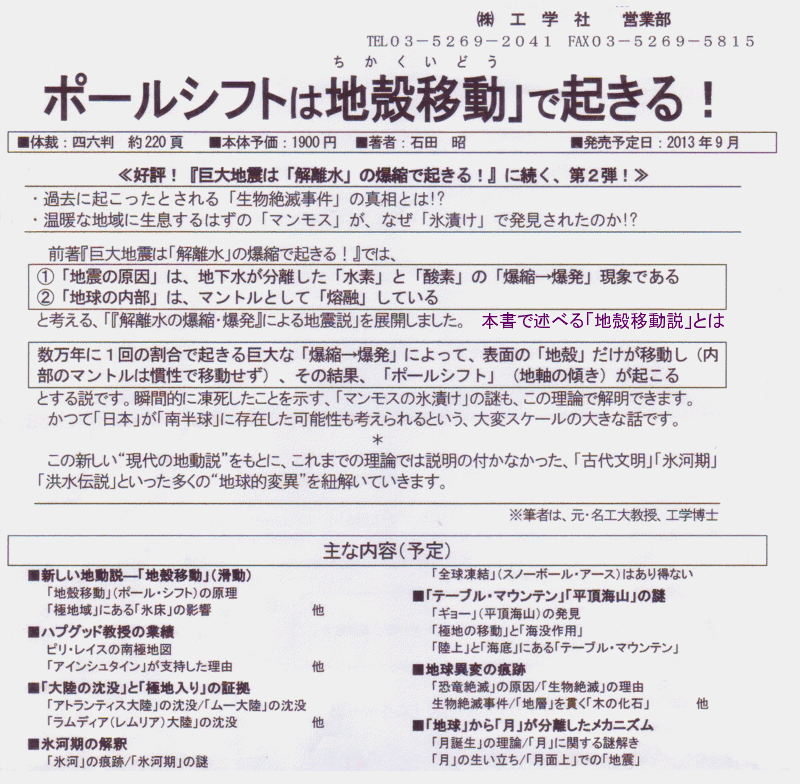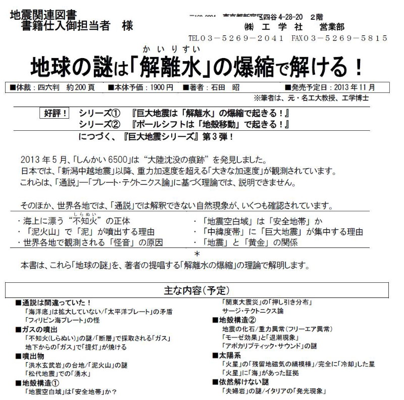 「地震爆発論」の要旨は工学社から「巨大地震シリーズ」三部作として(3作目は11月発売予定)公表しています。 |