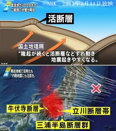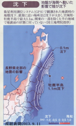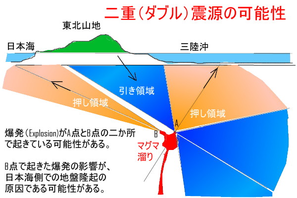 | 1857 Date: 2013-09-11 (Wed) 東北大震災 見えていない地盤変化の真相 本日の産経新聞では太平洋側の地盤が沈下したことに関して「地盤が海側へ動いた影響で陸が沈下」したと言う解説がありました。また、国土地理院提供のデータによると、日本海側が数センチ程度隆起しているともありました。 ![]() ![]() 地震爆発論で考えると、日本海側の隆起はM9地震(震源24km)が起きたときに、爆発が起きた地点、すなわちマグマ溜りから最初にマグマが動いて、平衡破綻爆発を起こした地点が複数(ダブル)あった可能性が推定できます。 ![]() なお、三陸沿岸一帯が地盤沈下している原因は、[1856]で述べた@、A、Bの三つの爆発で沿岸一帯が引き領域に該当したために、震源に向かって引きずり込まれるような動きになったからです。 |
