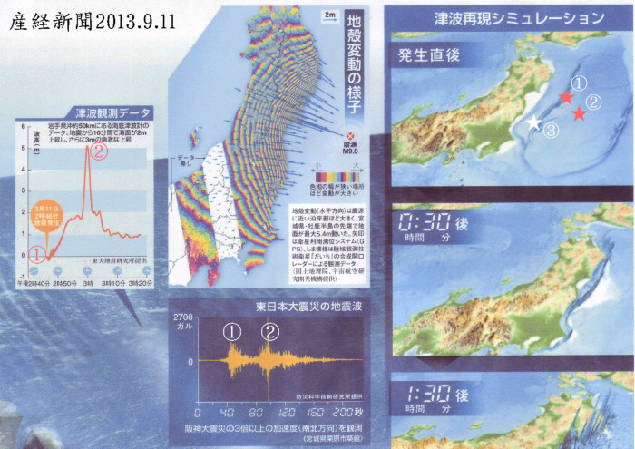 | 1856 Date: 2013-09-11 (Wed) 東北大震災 見えていない津波の真相 本日の産経新聞に「見えてきた被害メカニズム」と題して、3.11地震の津波が大きな被害を出した”真相”なるものを大きく報じていました。その一部を紹介しますが、なぜ福島原発を襲った津波があれほど大きくなったのか、まったく理解されておりません。産経新聞社にも拙著「巨大地震は「解離水」の爆縮で起きる!」を2冊献本しておきましたが、まったく参考にされておりません。どなたかが「マスコミの劣化が激しい」と述べておられましたが、同感です。東京大学を頂点とする地震学会の判断を鵜呑みにするだけで、記者自身の頭脳で判断することができていません。 ![]() 新聞記事の津波観測データにある記録は@という爆発とAという爆発が重なったものです。Aは@の60秒ほど後に、@の少し東南の場所で爆発したものです。 実際にはさらに遅れて、いわき市沖で爆発したBという爆発による津波が起きています。この@とAによって起きた津波が福島原発を北方から襲い、Bによって起きた津波が南方から襲ったこと、そして重なったことが、福島原発に大きな被害を与えたことが、まったく理解されておりません。 Bの津波を起こした爆発は、CCSと云う温暖化対策の一環として行われている二酸化炭素の地中封入プロジェクトによって起こった地震爆発である疑いがあるのですが、そうした観点からの原因究明がまったくなされないまま、現在また苫小牧沖でCCSが計画されています。 プレートテクトニクス論とか活断層理論を真理であるかのように妄信している地震学者には”地震は爆発現象”であるという『もう一つの地震学・石田理論』があることを知っていただきたいと思います。 拙著にも書きましたが25年間言い続けても、まったく反応を示さない学者とマスコミにはあきれ返るばかりです。 |