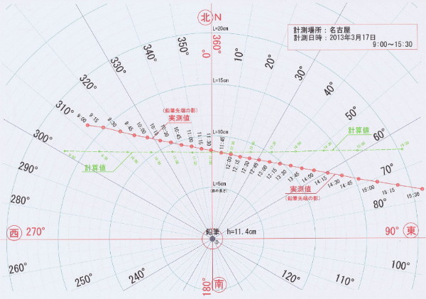 図ー Dこの状況下では日本付近では北回帰線が23度程度になって、現状とそれほどの違いは生じません。 ちなみに、太陽の変化が気になった方(名古屋在住の方)が、今年の春分の日(3月17日)に観測された興味深い記録があります。 http://whombi25.cocolog-nifty.com/blog/2013/03/post-ecf4.html 図のような観測器具を自作されて、鉛筆の影を計算値と比較されています。 ![]() 図ーE