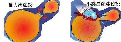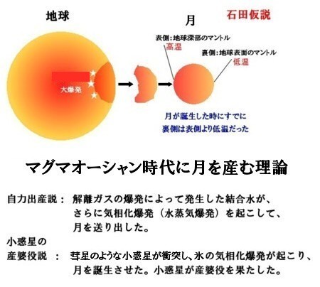 | 1853 Date: 2013-08-16 (Fri) 月の誕生説を再々度検討する 月が誕生したメカニズムに関しては、すでに[1585]で「マグマオーシャン時代に熔融マントルの内部に蓄積した大量の解離ガスが爆発を起こして、マントル物質を宇宙空間に放出した。」という地球の「自力出産説」のような解説をしています。また[1787]では、「自力出産説」と、「小惑星産婆役説」を提示し、気相化爆発を想定しました。しかし、解離ガスの気相化爆発は現実性が疑問視されますから、再検討が必要です。 そこで、新たに彗星のような氷を含んだ小惑星が地球に衝突することで「Explosion」が起き、この爆発でマントル物質が宇宙空間に放出されるという「小惑星産婆役」説を考えました。こちらのほうが月誕生を合理的に説明できるのではないかと思います。 彗星は8割近くが氷からできているそうですが、そうした氷を多量に含んだ小惑星がマグマオーシャンの地球に衝突し、マントルの内部に落下・侵入すれば、氷が液体になり、さらに気相化するときの爆発現象(気相化爆発・水蒸気爆発)が起きることが想定できます。このエネルギーによって地球のマントル物質が宇宙空間に飛び出すことは十分に納得できることです。 ![]() ![]() |