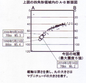 1995年4月1日、夜7時のNHKニュースは、倒壊した家屋の映像から始まり、そしてアナウンサーの「これは神戸の映像ではありません」という説明が続きました。1995年新潟県北部地震(M5.5)です。この年の1月17日に発生した兵庫県南部地震は、その被害の大きさから、2月、3月と時間が過ぎても連日のように報道され続けており、人々の地震災害に対する関心の高さを示していました。そこへこの地震が発生したのでした。 この地震には本震の数ヶ月前から特徴的な音響を伴う前震(本震に先立つ前ぶれの小地震)の活動があり、当時の地区理科センター有志が聞き取り調査や観測を行なっていました。 2 ハクチョウの数が少ない 1994年12月20日朝の瓢湖は前日からの雪で真っ白でした。瓢湖というのは、新潟県旧水原町(現阿賀野市)にある、ハクチョウの渡来地として有名な湖です。 「11月までに渡ってきたハクチョウはいつもにくらべて少なくはなかったのです。雪のせいでしょうか。雪が積もった日(12月19日)の翌朝、みんな一斉に南の方へ飛んでいってしまいました。」 ところで、1994年12月19日14時19分に、この地域の深さ約10kmでマグニチュードM4.2の地震が発生していました。これは瓢湖の管理人さんがいう「雪の降った日」に一致しています。たぶん、ハクチョウは地震動そのものか、あるいはそれに関連した何かの現象におびえて飛び去ったのだろうと思われました。 3 鳴動の聞き取り調査 一連の鳴動(前震)の中で、私がはっきりそれと意識したのは、2月4日の朝のものが最初でした。それは、地震かどうかは判断に迷うような感じで、文字通り鳴動とでも呼ぶべき特異な現象でした。腹に響くドーンという衝撃が一回、あとは何も揺れません。なにか、衝撃波を受けたような感じでした。重いものが地面に落下したときのような感じでもあります。音が聞こえたような気もしました。人に聞くと前日の夜にも同じ鳴動があったといいます。皆さん一様にその衝撃の不気味さを感じていました。そこで、鳴動の発信場所であるらしい地区の理科センター所員数人でグループを組んで調査観測をはじめることになったわけです。 2月上旬の鳴動を伴う地震は全ての人が気づいていたわけではありません。むしろ、知らない人が多かったのです。だから、受け取りようによっては来るべき地震を予知しているようなものでした。無用な予知騒ぎは本意ではありません。それで、ファックス送信用紙の表題は「新潟県北東部の群発地震について」として、カムフラージュをかけたものです。 4 鳴動は新潟地震の前にもあった 過去に同じようなことがなかったかどうかも調べました。すると1962年〜1963年頃、新潟県旧中条町(現胎内市,新発田市より約20km北方)で、原因不明の(やはりドーンという感じの)大音響が観測されていたことが分かりました。地元の古老によればそれ以前にも何度も聞いていたそうです。しかし彼はその音を海岸に打ち上げられた機雷の処理作業だと考えていました。終戦後何度か海岸で漂着機雷の爆破処理作業があったというのです。推測の域は出ませんが、1964年新潟地震の震源域に近い新潟県北部地方では戦後から1964年頃の間に、このような大音響を響かせる前兆があった可能性があります。そして重要なのは、新潟地震の後ではこのような大音響は観測されていないということです。ただし、今回の鳴動まで。 5 地震データの閲覧と鳴動調査の照合 新潟地方気象台を訪ねて、はじめて地震データを閲覧したのは2月13日のことです。気象庁暫定と呼ばれる震源要素(緯度経度、深さ、規模、時刻)とグループの聞き取り結果との照合をすることができました。 ![]() 図3 1995年2月〜3月の間に使用した「前震」記入用の20万分の1地勢図。黒丸の大きさは地震の規模を表している。 その後も数日おきに気象台に出かけて記録を調べては,20万分の1地勢図に逐次手作業で追加記入していきました(図3)。 図4 に地震(鳴動)発生の状況を日別の時系列グラフ(横軸に時間、縦軸に回数)で示します。これも地震が起こる前の2月中旬ころから作成しはじめ、聞き取り調査や地震データが入るたびに書き加えていったものです。 ![]() 図4 新潟県北部での「前震」の日別グラフ.○印は聞き取りで鳴動が確認された前震。 6 鳴動は前震か 一連の地震が群発性の活動なのか、それとも前震なのかは普通見分けるのが難しいとされています。にもかかわらず、研究グループが前震と確信したのは以下の根拠によります。 次は記事にもありますもう一つの調査例、萩原尊禮先生たちがおこなった「東京大学地震研究所の調査を」を紹介します。 |