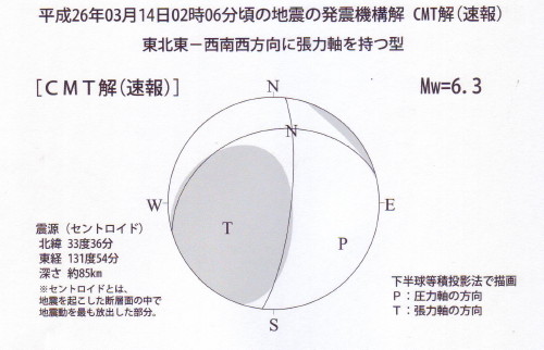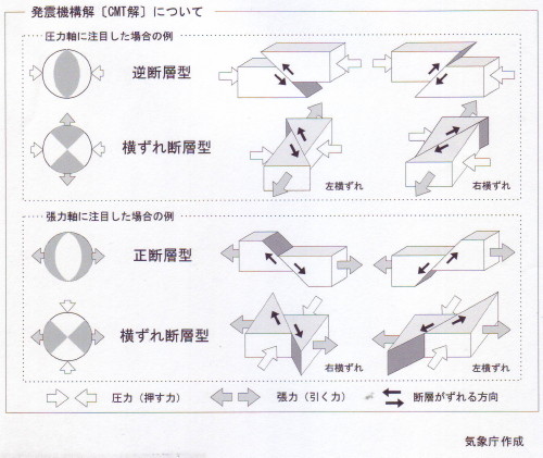 | 1927 Date: 2014-03-27 (Thu) CMT解の正しい解釈 石田理論についてネット上で次のように書き込んでいる人は、大学で「地震学」を学んだことのある方でしょう。既成の間違い理論が頭に入っていて、地震爆発論を弾いてしまうのだと思われます。 ―――――――――――――――――――――――― http://www.asyura2.com/10/bd59/msg/652.html その理論の提唱者は、幸福実現党の石田氏ですね。 通称、石田理論、ANSなんとかと呼ばれていますが、実証データもないお粗末な空想理論です。 真偽はともかく、一部熱狂的に支持されていますが、地学研究者からは全く相手にされないトンデモ論です。 Wikipediaにすら登録されていない、ローカルネタです。 ―――――――――――――――――――――――― http://archive.jisbbs.com/1211/article_190276.html 地震爆発説(いわゆる石田理論)信じている方って多いのかしら? あの仮説って、読めば読むほど矛盾だらけなんどけどなー、何で信じる人が居るのか不思議ですね。 ―――――――――――――――――――――――― 空想理論を信じる方から、空想理論呼ばわりされるのは“片腹痛し”というものです。 二十年以上も昔のことになりますが、土木工学関連のある研究集会で島崎邦彦先生からCMT解の解説を受けたことがあります。力学をベースに考える土木技術者にとっては物理現象との結び付きが理解し難いものだなと感じたのを覚えています。 CMT解の概念は各地の地震計でキャッチされる地震波の初動(押し、引き)の出所を震源を中心とする震源球の上に引き戻して表示しようとするものです。 しかし、石本博士らが考えていた「押し」、または「圧し」(Compression)と、「引き」(Dilatation)の意味が、まったく逆になって使われています。 石本先生は”押し円錐”の内部が震源から離れる動きで「押し」、それ以外の周辺は震源に引き込まれる動きで「引き」と定義していました。今の気象庁の解説では震源から離れる動きを「張力:T」、逆の動きを「圧力:P」と表示しています。言葉の意味、物理的な概念がまったく逆転してしまっています。爆発で押される動きが張力で引っ張られる動きと置き換わってしまいました。