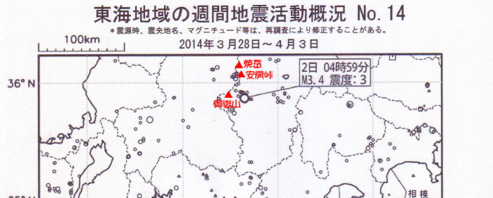 | 1985 Date: 2014-06-15 (Sun) 飛騨高山の群発地震を危惧 飛騨高山の安房峠付近(焼岳の近く)と御嶽山の東付近でこの春から群発地震が起きています。群発地震は勿論活断層理論では説明できません。火山帯の地下には浅い場所にマグマが存在し、そこでの熱解離現象が安定しておらず、解離と結合を繰り返しているのが群発地震です。