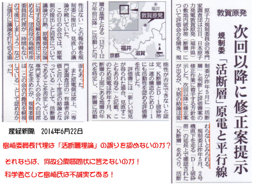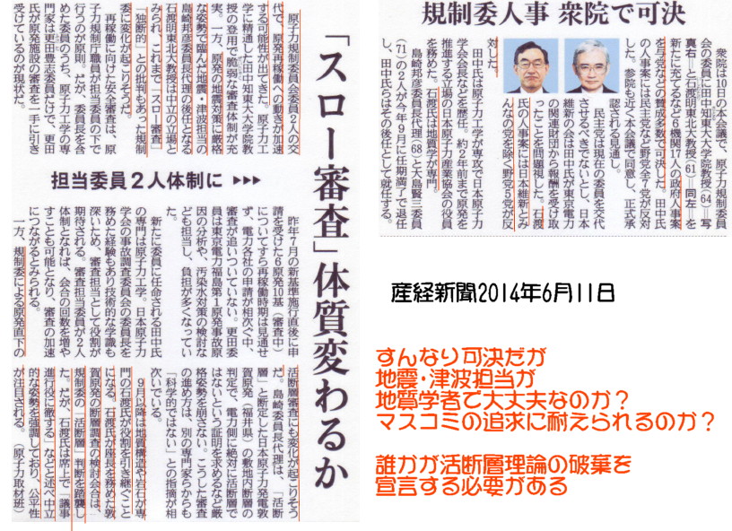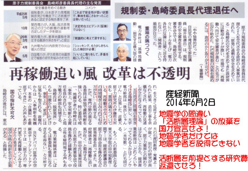 ところで、島崎氏の後任の石渡氏は地質学の専門家です。地震や津波に関してマスコミに説明できる見識があるとは思えません。「スロー審査」を抜け出すためには、誰かが「活断層理論の破棄」を宣言しなければいけません。 島崎氏が勇気ある学者ならば、公開質問状に回答を出し、活断層理論の「破棄」なのか「支持」なのかを鮮明にすべきです。回答が出せないのなら、活断層理論の間違いを認めたことと同じですから、「破棄宣言」を地震学者として出すべきです。音なしの構えで敵前逃亡するような学者ならば致し方ないですから、文科省なり、政府のほうから「破棄宣言」を出すべきです。でないと、審議のスピードアップは期待できません。 マスコミの科学記者に 「公開質問状」に答えてもらえばよいと思います。 島崎氏への公開質問状 |