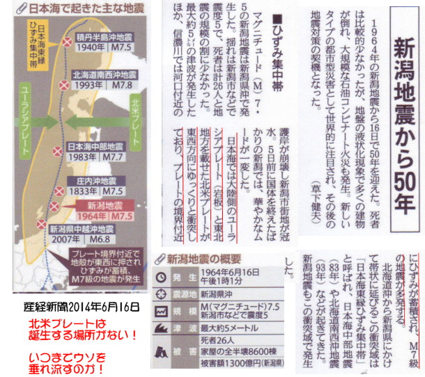 | 1986 Date: 2014-06-16 (Mon) プレート論を破棄せよ 今日の産経新聞に「新潟地震から50年」という記事がありました。地震が起きたのは大陸側のユーラシアプレートと東北地方を載せた北米プレートが東西方向に衝突して、歪が蓄積されるため、という説明になっています。