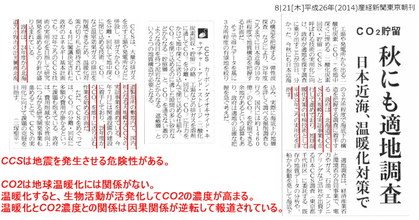 | 2009 Date: 2014-08-22 (Fri) 再度の指摘「CCSは地震を発生させる危険性がある」 昨日の産経新聞でCO2貯留の調査を日本近海3箇所程度で開始するという報道がありました。
