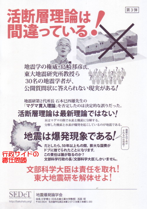 地震爆発論学会会長石田は絶対に許さない。 国民の皆様、いまこそ民主党が残した「悪魔の罠」を廃棄しましょう。 ーーーーーーーーーーーーーーーーーーーーーーーーーーーーーー この決意の下に、島崎氏への公開質問状の送付、安倍総理宛への「島崎氏更迭を要求する署名活動」等を展開し、5月26日、27日には東京都内で街宣活動を展開しました。政府は「渡りに船」と思われたのでしょうか、27日に「島崎氏ら2名を再任しない」と発表しました。 しかし、これは外科手術を先延ばしするようなもので、本当は即座に「更迭」を発表する勇気が必要でした。案の定、島崎氏は当学会からの「公開質問状」(同封しました)に答えることもせず、依然として電力会社に高圧的な姿勢で、対処しています。このままでは原発再稼動が遅れ、国家には深刻な後遺症が残ることになるでしょう。 そこでお願いです。同封したチラシに示しましたように、「活断層理論は間違っている」の第3弾として(第1弾:リーダーとしての島崎氏の責任追及、第2弾:研究者サイド、たとえば東大地震研の責任追及)、膨大な国費をドブに捨てるような文部科学行政を長年放置してきた責任を明確にする必要があると考えます。 文部科学行政の責任者はトップ(文部科学大臣)にあることは明白です。文部科学大臣は責任を取って、職を辞するとともに、「東大地震研の解体」を断行して頂きたいと思います。 この姿勢を示すことで、国家として「地震研究」の方向転換を明確に決断して頂きたく、両院の国会議員の皆様に御尽力いただきたいとお願いする次第でございます。 平成26年6月27日 草々 地震爆発論学会 会長 工博 石田昭 |