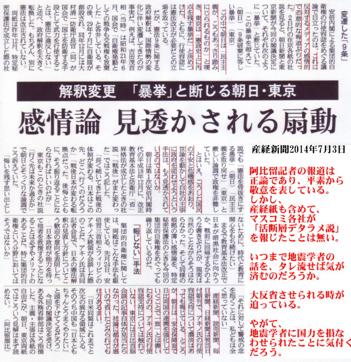 | 1999 Date: 2014-07-03 (Thu) マスコミの「報じない手法」の付けが来る時代 本日の産経新聞に集団的自衛権の行使容認をめぐる報道で、メディアが感情的になって恣意的な報道をしている、という阿比留瑠比記者の記事がありました。 ![]() |