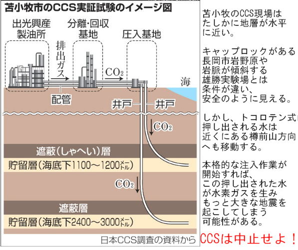 それによって「人為的な地震」を起こしてしまうことが「マダワカラナイノカ」といいたくなります。 現在行っている苫小牧沖でのCCSは、いわき市沖で行われていたCCS現場が東北大震災で破壊されてしまったため、ということですが、いわき市沖のCCSそのものが東北大震災の被害をあのように大きなものにしてしまった原因でもあるのです。CCSの現場が第3の震源地になっていた可能性が高いのです。 いわき市沖のCCSの現場から発生した人為的地震による大津波が発生していなかったら、福島第一原発の前面で「北からと南からの津波が重なる」ことはなかったのです。 学者も行政もマスコミもまったく不勉強で「だらしなし」と言いたくなります。 いい加減に気付いていただきたいものです。 |