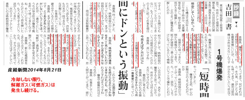 | 2010 Date: 2014-08-22 (Fri) 吉田昌郎所長の判断を支持 昨日の産経新聞には福島第一原発の吉田昌郎所長の「1号機爆発」に関する調書も載っていました。 吉田氏 「爆発については全然想定していなかった。免震重要棟にいたが、1号機は全然見えないんですね。線量が高いから外に出られないような状態で、誰も外に行って見ていない。その時に下から突き上げるような、非常に短時間のドンという振動がありましたから、また地震だという認識でおりました」 −−水素が発生しているという認識は持っていたのか 吉田氏「持っていました。ただし、格納容器の中にとどまっているので、まずは容器の圧力を下げないといけない。加圧している原因が水素であり、これをベントで逃してやらないと」 今思えばアホだけど −−水素爆発が意外だったというのは何か変ではないか 吉田氏「格納容器の爆発をすごく気にしていたわけです。今から思えばアホなんですけど、水素が建屋にたまるという思いがいたっていない。今回の大反省だと思っているけれども、思い込みがあって、あそこが爆発すると思っていなかった。所長としては何とも言えないですけれども」 −−徹底的に考えないと 吉田氏「今回のものを設計にどう生かすかという所が一番重要だと思っている。これからこの国が原子力を続けられるかどうか知りませんけれども、続けられるとすればそうですね」 「次のステップとして一番怖いのは格納容器が爆発するんじゃないかということになるが、データを見ていると容器の圧力は爆発前後で大きく変わっていないわけです。格納容器は健全だったということなので、要するに可燃源はもうなくなっている可能性が高いと判断して、水を入れに行かないとどうしようもないので、人をどうするかという判断が一番悩ましかった」