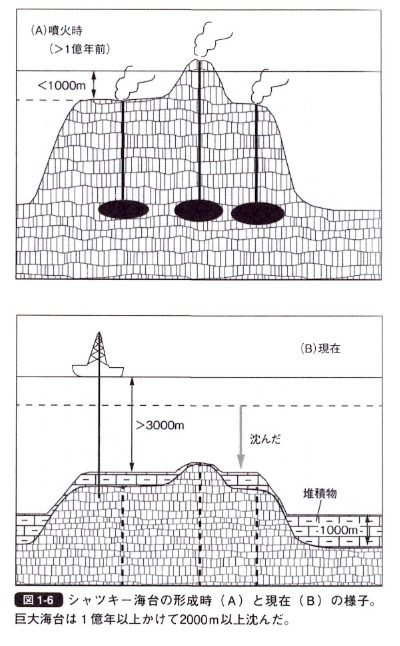 シャッキー海台の上の海山の説明も説得性がありません。ギョー(平頂海山)の上に「新しい火山」が出来たものですが、ギョーができたのは極域の氷底湖内での火山活動の時代で、「新しい火山は」地軸が変化して極域を離れてから噴火して出来た火山だと考えたほうが論理的です。
