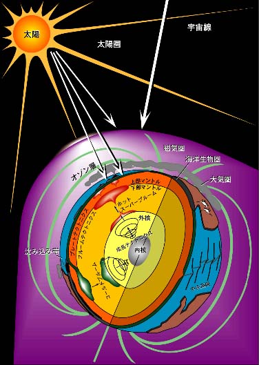 その後、ァセノスフェアやさらに深部の核についての情報が集まり始めるにつれて、プレートテクトニクスは、核や下部マントルまでを含めたテクトニクス、すなわち“全地球テクトニクス”の体系の一部として位置づけられるようになってきた(Maruyama et al.、1994)。全地球テクトニクスの立場では、液体である外核の流動や下部マントルの上下方向の超巨大プリュームの運動、さらに地球表膚での水平運動を主体とするプレートテクトニクスが全体として一つの系をなして相互作用をしていると考えるのである。