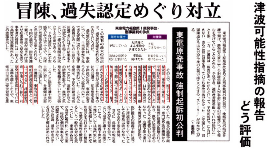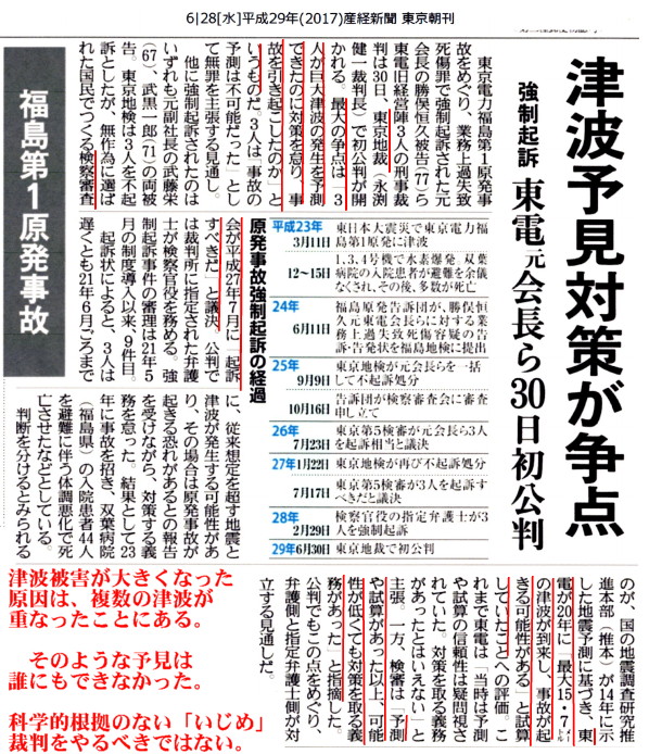 産経新聞を見ると、当時土木学会の「津波評価技術」による基準を満たしていたそうですから、幹部の刑事責任を問うのは過酷過ぎます。