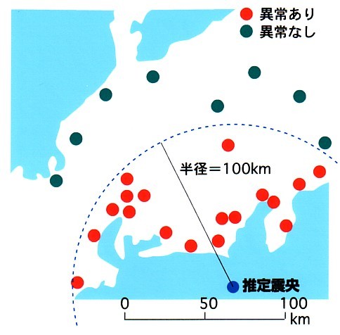 | 第一段階:震源付近にまず、赤点(異常ありという報告のこと)が発生する。 第二段階:赤点の範囲が地震規模に応じて広がる。この時の広がりの直径(2L)から地震規模が判定できる。 |