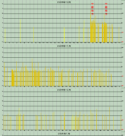 これと同じような危険な実験が震源の近くで行われていたのです。中越地震の震源から15キロしか離れていない長岡市深沢の帝国石油の採掘サイトで、温暖化防止策の一環として地中に二酸化炭素を封じ込めようと言う計画のための試験が地震発生の1年3ヶ月前の2003年7月から、2005年1月まで行われていたのです。 http://www.rite.or.jp/Japanese/project/tityu/nagaoka.html これが地中の解離度をどの程度変化させるものかは良く分かりませんが、地下に於ける水の解離現象を検討することも無く、人為的に地下空間を細工することは大変に危険であると思っています。[955]で質問された方の危惧にもありますが、デンバーでの注水実験で起こった地震の解釈は断層地震説と爆発地震説では全く違ったものとなり、爆発説に準拠すれば危険な行為になる可能性を含んでいます。私は廃液の注入と言い、二酸化炭素の注入といい、あるいは地下空間の大規模掘削といい、地震を誘発させる危険な行為であると認識しております。 新潟県中越地震は人為的に起こしてしまった地震であるという疑いを捨てきれないのではないかと思っているのです。 下に示した図は中越地震と、兵庫県南部地震における3ヶ月間の余震発生状況を示したもので、縦軸はマグニチュード、横軸は時間です。明らかに中越地震のほうが規模が小さい地震であるにもかかわらず頻繁に余震が起きていることが分ります。中越地震では発生後5ヶ月経った今でも余震が止まっておりません。 |