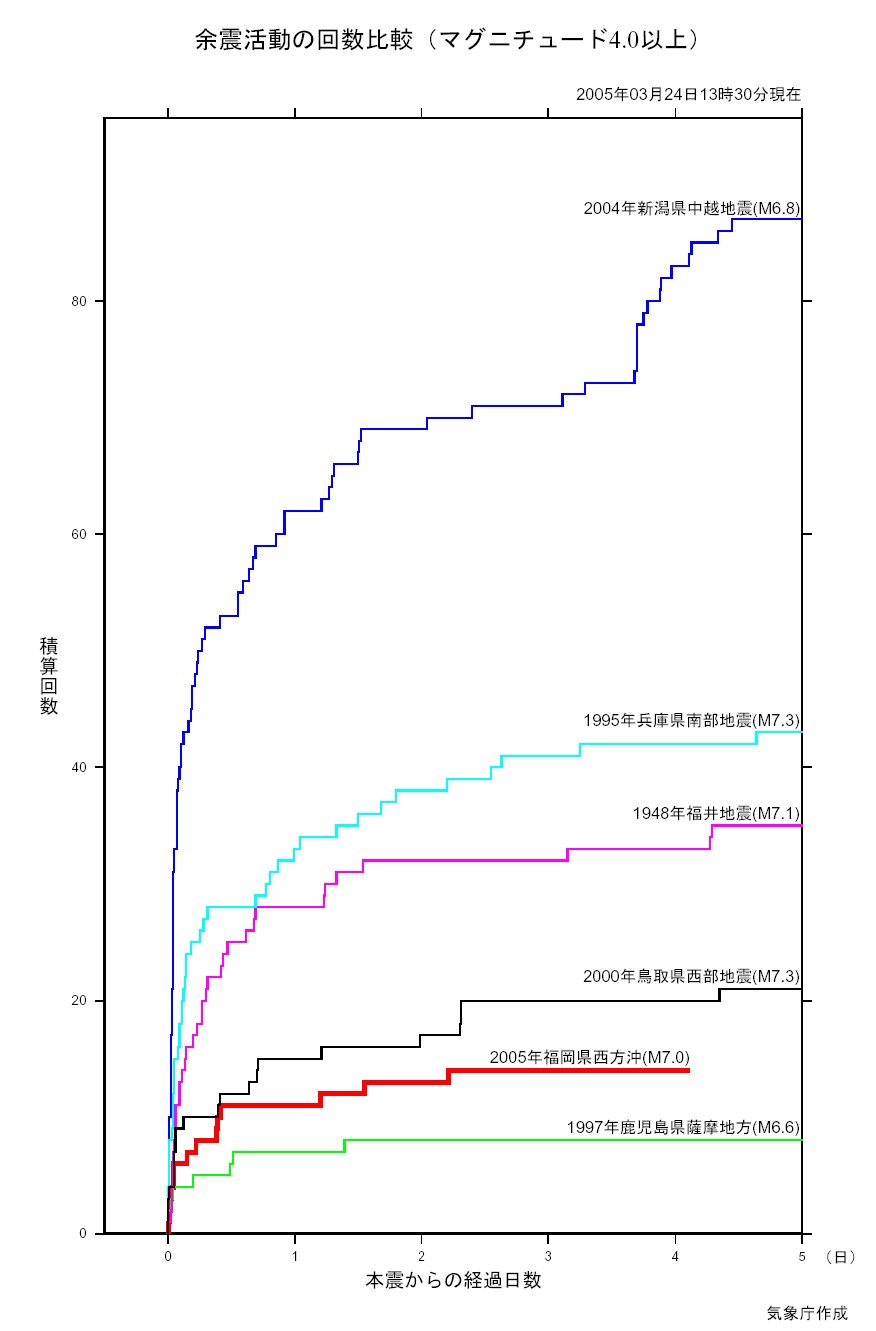 下の図は地震発生からの5日間に起こった中越地震及び阪神淡路大地震などの積算余震回数(M4.0以上)を示したものです。気象庁のサイトから転載させていただきました。明らかに中越地震の余震は兵庫県南部(阪神淡路)地震、福井地震、今回の福岡西方沖地震よりも頻繁に起こっていることがわかります。中越地震だけ何故このように余震が数多く発生するのでしょうか。説得力のある解説は今のところ無いようです。 |