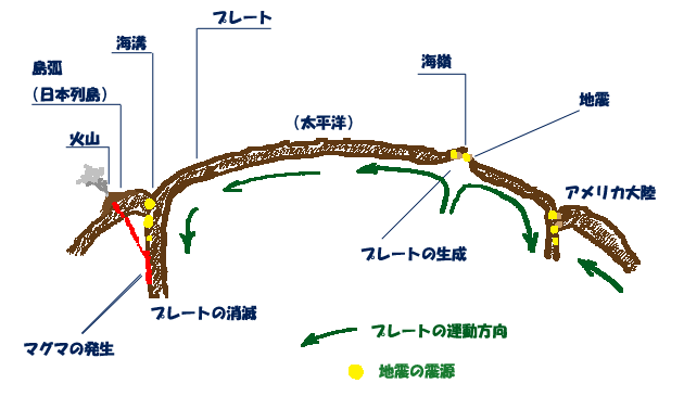| 内部の高温の物質が海底の海嶺(海底の山脈など)で地球の表面にわき出し、厚さ数10km〜100kmの板状(プレートといいます)となり、1年間に数cmの速さで両側に広がっていきます。 これが海底を形づくっている「海のプレート」です。 陸地を形づくっている陸のプレートと衝突すると海のプレートの方が密度が大きいため、陸のプレートの下に沈み込んでいきます。沈み込むところが海溝になります。 地球の表面は、いくつかのプレートでおおわれており、それぞれのプレートの境目が、海嶺や海溝などに相当します。 海のプレートの沈み込みの地域(海溝沿いの地域)では巨大地震が起こります。 |