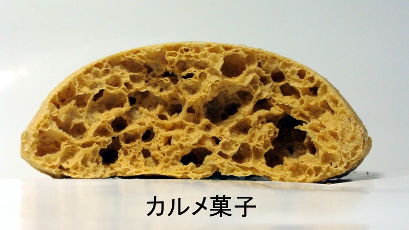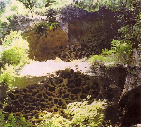 | まず、一枚の写真をみてください。地震多発地帯である南紀の熊野灘に面した観光地、鬼が城の近くの山中で見つけたものです。爆発による押し領域内のマグマが泡を包んだ状態で冷却したものです。地震の化石といってもよいでしょう。カルメ菓子のように、空隙がたくさん見られます。海岸近くの鬼が城の断崖で見られる浸食されたものより、もっと発泡状態が明瞭に見られます。これは、太古の地震のときに、震源近くのマグマ溜まりにあった溶岩が泡状になって固まった後、その後の大地震によって地上に浮上してきたものではないかと思います。 猿で有名な宮崎の幸島にも同じような岩があります。 |