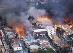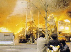 二枚の写真は神戸を襲った地震による大火災です。家が潰れるだけなら突風でも竜巻でも起こりますが、竜巻で大火災になることはありません。大地震は揺れるだけではなくて、大地から可燃ガスである解離水を噴出する現象と認識するべきです。 |