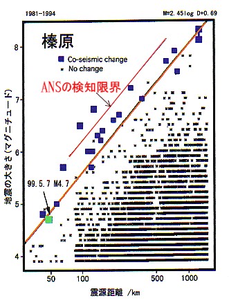 図ー2 榛原観測所における地下水位による地震の検知と地震規模との関係、ANSの地震検知限界は水位観測よりも感度が鈍いと思われる(セミナー280参照) |