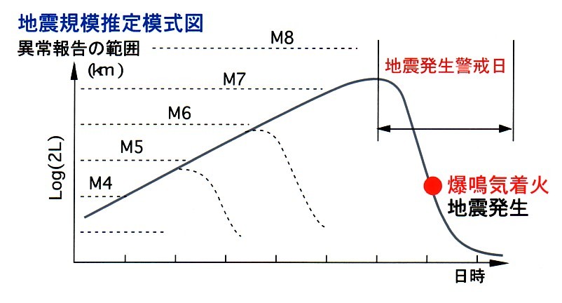 この時の広がりの直径(2L)から地震規模が判定できます。(図ー4参照)たとえば、直径20kmならば、M3.8でそれほど心配はいりません。直径200kmであれば、M6.2です。東海地震で想定されているM8巨大地震ならば、直径1120km 、 M7地震で、直径420kmといった具合です。地震規模に応じて、広がりが停止するまでの時間も長くなるでしょう。数値は今後の観測データの蓄積で変更されます。 第三段階:解離が終了すると、赤点がしだいに減っていきます。この間に降下していたマグマ溜り周辺の温度が再び上昇していきますが、この赤点の広がりが減少に向かっているどこかの時点で、爆鳴気に着火して地震の発生につながるでしょう。あるいは、全て消滅してからかもしれません。 第四段階:地震の発生が無ければ、解離ガスが地上に漏出して、異臭騒ぎを起こしている場合、または解離反応の速度が緩慢であったために、自然順応速度内に収まって、爆鳴気爆発に至らなかった場合などが考えられます。地震発生があれば、その環境における解離度に落ち着くまで、次の余震に向けて、同様の解離反応プロセスが、繰り返されるでしょう。 震源位置の予測 震源は勿論赤点が描く円の中心部です。観測点が蜜に配置してあれば、震源が海域にあってもある程度の位置予測は可能です。 発生日時の予測 図ー4は上の述べた地震規模の推定を説明するための模式図です。地震の発生は水位記録のように、地震発生即水位低下という変化ではないと思われます。それは、解離反応の終息後、温度が回復して爆鳴気に着火するまでに時間がかかるからです。 |