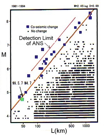 Fortunately, however, the sensitivity of ANS observation of oil magnetic compasses is presumed to be lower than that of underground water level observation. The fact isn't troublesome for ANS, as we aim at the forecast just before the big earthquake. It becomes difficult for us to predict big earthquakes if we concentrate too much on small tremors, which is just like looking at individual trees without looking at the forest. It's the big earthquake that we have to predict, so the poor sensitivity can be just right for the purpose. According to an ANS observer in Sendai City, his compass failed to detect the M6.2 earthquake which occurred 130 km away. When this conditionql=6.2, k=100 kmris taken into account, the detection limit of ANS can be formulated as follows;. l=2.4logk{1.4 |
