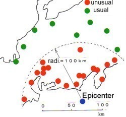 | @The method used in the ANS earthquake forecast is as follows; Fig.1 shows the distinction of contents of reports with positions of observation. Red points show changes in the direction of the oil magnetic compass(more than 4 degrees), while green points show no change and light green no report. The scale of the predicted earthquake grows as the radius of the red-point area lengthens. Here's the reason; Prediction of the earthquake scale |