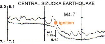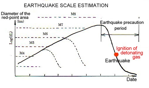 | Let me estimate the process of the earthquake from the starting of the deviation in oil magnetic compass to the actual occurrence by using this formula. Fig.3 shows a record of underground water level observed at Haibara Observatory at the time of a M4.7 earthquake. This figure will help you understand the process more easily. 1st stage: Reports of unusual deviation in oil magnetic compass start to come in around the epicenter of the earthquake. These reports are shown in red points on the map. When the earthquake epicenter is in the sea area, it takes some time for the red points to appear. 2nd stage: The red-point area spreads out in accordance with the scale of the earthquake. While the red-point area spreads, temperature around the magma chamber falls. It's when the dissociation of water is finished that the red-point area cease to spread. The scale of the earthquake can be estimated by the diameter(2k) of this red-point area. @@ For example, when the diameter is 20 km, the scale of the earthquake is estimated at M3.8, and you need not worry about a big earthquake. But when the diameter grows to 200 km and 420 km, the scale of the arthquake is estimated at M6.2 and M7.0 respectively. And when it's 1,120km, the huge earthquake of M8 as one predicted in Tokai Region could occur. As the scale of the earthquake increases, it takes longer for the red-point area to cease to grow. There should be some change in the numbers above through future observations. 3rd stage: The number of red points start to decrease gradually when the dissociation of water is finished. At this stage, temperature around the magma chamber starts to rise. When the temperature reaches the ignition point, it explodes and the earthquake is caused. It is possible that all the red points disappear before the explosion. 4th stage: If the dissociation is slow enough, the expansion of the dissociated gas might not go beyond natural inflation and not result in explosion. When the earthquake(explosion) does occur, the same type of process will be repeated toward each aftershock. The prediction of the earthquake center The earthquake center, of course, is at the center of the red-point area. If the observation points are distributed densely enough, the earthquake center is predictable to some extent even when it is in sea area.