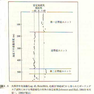 | 1149 2006-02-23 (Thu) 深さによって変わる地磁気異常の縞模様 ライブラリー28に紹介した星野先生の次の文章にあるデータが「新しい地球観を探る」に載っていました。 「中央海底山脈で湧き上がったプレートは、そこで特有の地磁気の性質を与えられ、この性質は、移動するプレートに伴って海底を動いていく、といわれていた。これはブレート説を支える重要な柱である。ところが、海底の岩盤を掘って調べてみると、上層の試料と下層の試料で、地磁気の性質がちがっている例が知られた。このことは、海底の岩石層は、一枚のプレートとして湧き出したものでないことを示している。」 ![]() これは大西洋中央海嶺でのボーリングで得られた資料です。船上では海底表層と同じ正帯磁の異常だったそうですが、その下部に3回の磁気逆転を記録していたのです。 「大西洋中央海嶺下に、20〜30万年×3回というきわめて長い時間にわたってほとんと水平に移動しなかった海洋地殻が存在していたということは、その海嶺付近では、海洋底の拡大が長い年代にわたって行われなかったことを意味する。このことは海洋底拡大自体の否定につながるのではなかろうか。」 石田理論では、磁気の縞模様というのは海嶺頂部から噴火によって押し出された溶岩が山腹斜面を流下して固まるときにそのときの地球磁場を記録して帯磁するのではないかと考えていますが、そうした現象が何層にも渡って繰り返された場所があるということではないでしょうか。 なお、図は伏角を計測したものですが、第一正帯磁ユニットのなかだけでも伏角が変化しています。伏角はその地点の緯度を表していますので、かなり地球の姿勢は変化しているのではないかと思います。グランドキャニオンの地層が教えてくれていることもそうですが、地球はポールシフト現象によってかなり頻繁に・・・といっても何万年に一回という程度ですが・・・太陽に対する姿勢を変えているのだと思います。 |